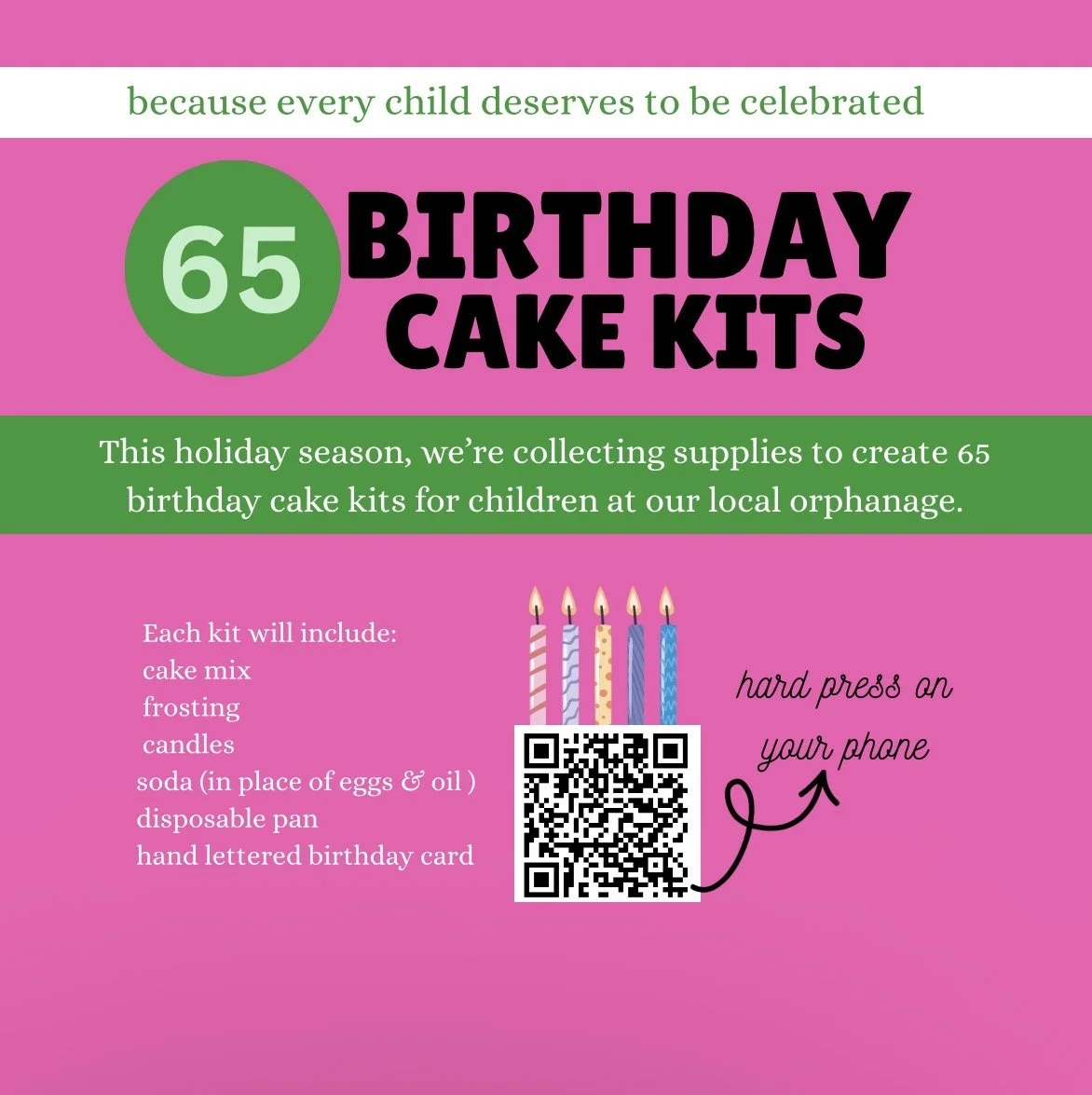 We’re hoping to provide a birthday cake kit for every child at a local orphanage—that’s 65 kids who deserve a reason to celebrate.
